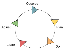 My personal take is that the best methodology is actually observe-plan-do-learn-adjust. Visualized in image 5 below, my take is that a careful observation of a system or process is necessary before any improvement can take place. The plan step is for defining the problem, defining the metrics that will be measured, and developing concrete steps to make the desired improvement. Once the steps have been laid out, it’s time to assign people a set of particular responsibilities and have them execute on them. Once the work has been done, studying it to learn what really worked or did not work is necessary. Finally, if the results were not what was intended, make adjustments as needed. That likely means revisiting the observation stage, and beginning the process again.