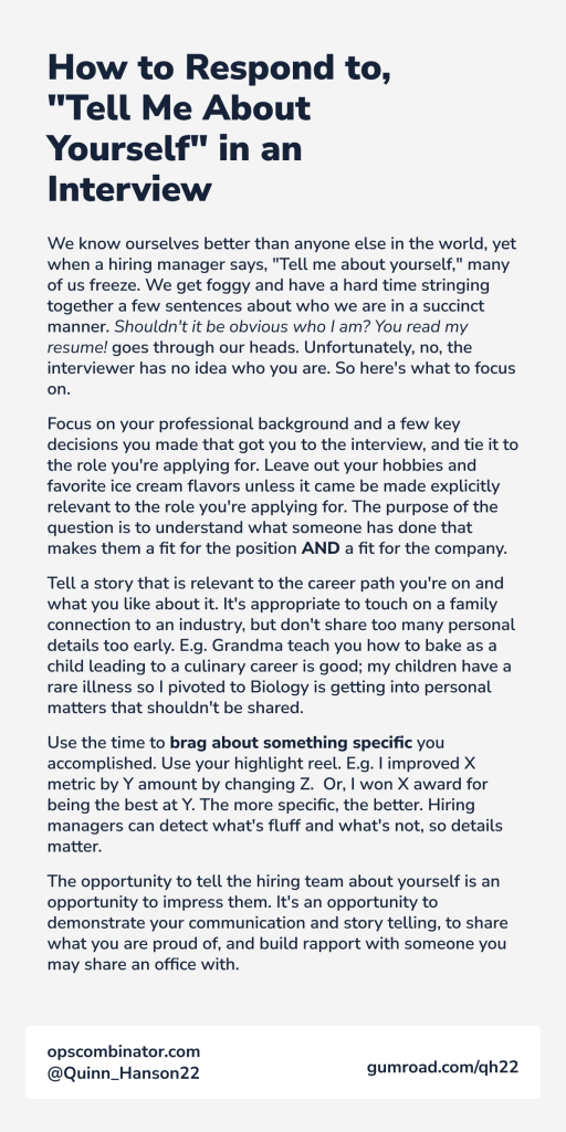 The opportunity to tell the hiring team about yourself is an opportunity to impress them. It’s an opportunity to demonstrate your communication and story telling, to share what you are proud of, and build rapport with someone you may share an office with.