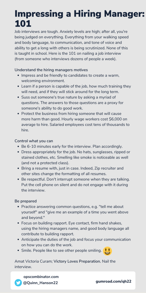 - Dress appropriately for the job. No hats, sunglasses, ripped or stained clothes, etc. Smelling like smoke is noticeable as well (and not a protected class).