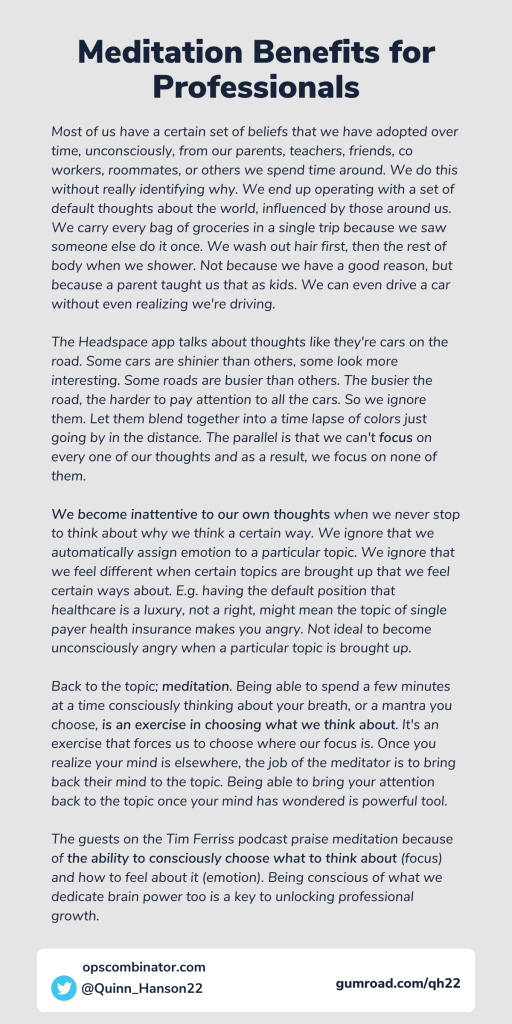 The guests on the Tim Ferriss show praise meditation because of the ability to consciously choose what to think about (focus) and how to feel about it (emotion). Being more conscious of what we dedicate brain power too is a key to unlocking professional growth.