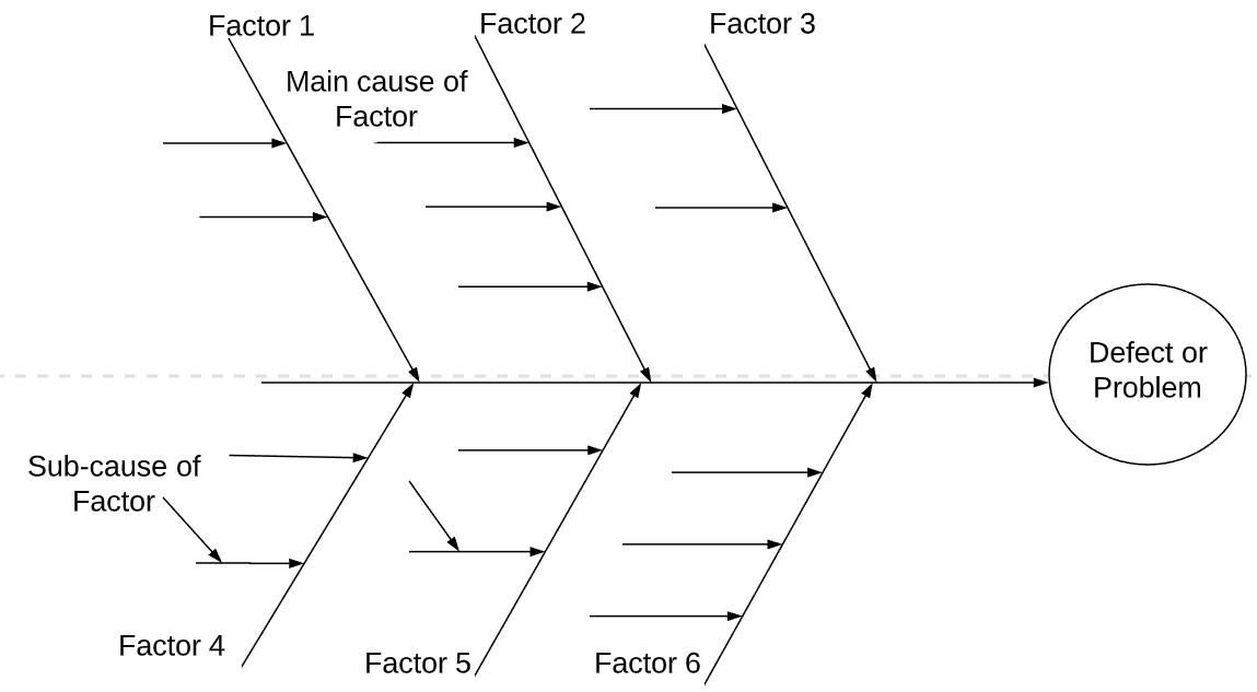 Also known as fish bone diagrams. The purpose is to identify the source of quality defects. Similar to asking why five times, but formalized in a document.