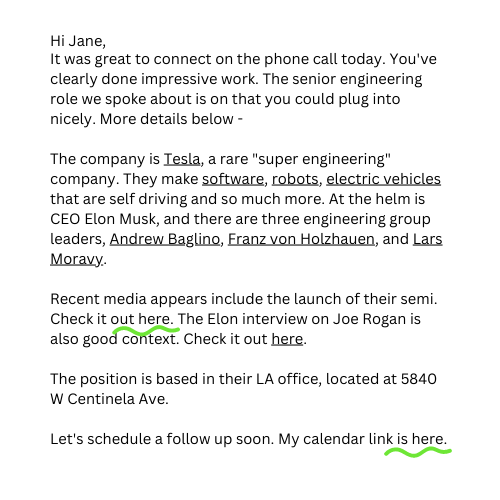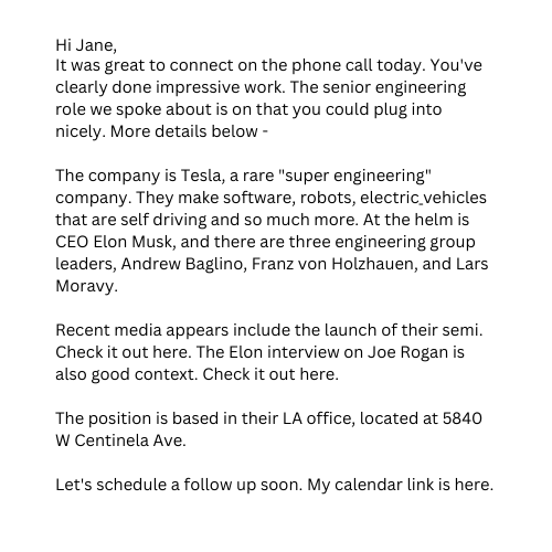 In a highly automated world, a human connection – speaking to someone on the phone – is harder to do as companies turn their customer service into chatbots. Instead of automating the conversation, we believe we should automate the follow ups & action items. VoiceLink is a software product that records your conversation, turns the script into an email template, and automatically inserts links to relevant sites for more information. Insert a founder’s Linkedin (or other social links), a podcast link, a client or portfolio company website, a job board, driving directions, a shopping page, and so much more.